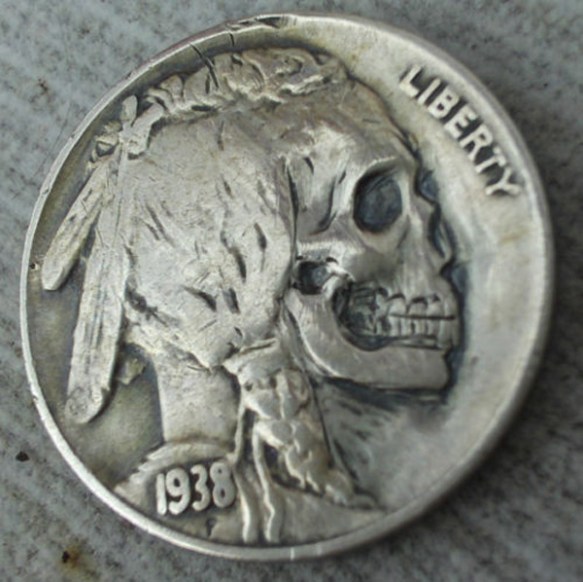 “Although the history of carving miniature bas relief sculptures into coins stretches back to the 18th century if not earlier, it was greatly popularized in the early 20th century with the introduction of the Buffalo nickel. This particular coin was minted using soft metal and was imprinted with the portrait of an indian with bold features, making it easier to deface and transform into the portraits of other people, animals, or even scenery. Add to that the idle hands of unemployed artists during the depression (thus, “hobo”) and soon a flood of curious numismatic treasures were born. Most of the images on hobo nickels are too folk artsy for my taste, however a number of artists etched away the flesh of the subject to reveal these awesomely macabre skulls. Hobo nickel carving remains a popular hobby today and it even has a society. Don’t you wish we had actual money that looked like this?” (via Colossal).