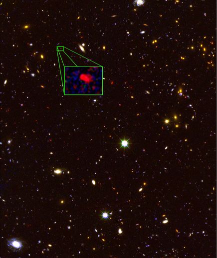 ‘Astronomers have found a galaxy 13.1 billion light-years from Earth, making it officially the most distant object ever detected.A faint, infrared speck of light from this ancient galaxy, called z8_GND_5296, was spotted using the Hubble Space Telescope and one of the world\’s largest ground-based telescopes, a ten-meter telescope at Keck Observatory at the summit of Mauna Kea, Hawaii.Light from this baby galaxy began its journey when the universe was about 700 million years old and just emerging from the cosmic mist left over from its birth…’ (via National Geographic).