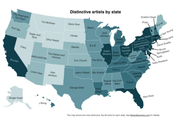‘Musical preferences have become increasingly uniform across the country, but there are still some pretty strong regional preferences. This map breaks down those distinctive preferences along state lines.