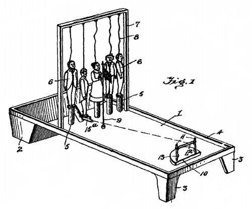 via Futility Closet: ‘Eugene Graves and William Brown patented this grim game in 1902. A row of effigies stand on blocks under a gibbet. Each effigy is fitted with a noose, and the players take turns shooting balls at the blocks, “representing summary punishment meted out to the victim.”