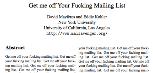 Via io9: ‘The International Journal of Advanced Computer Technology, a predatory open-access journal, has accepted for publication the marvelously titled paper “Get me off Your Fucking Mailing List.”