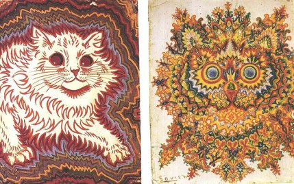 ‘…just as today’s cat lovers flood the internet with anthromorphized felines, Victorian-era Englanders also found representations of the pets to obsess over—namely, the cats drawn by prolific illustrator Louis Wain, whose cartoonish animals populated the era’s magazines, children’s books, and postcards. During Wain’s life, though, his fortunes reversed several times. Believed to be suffering from schizophrenia, Wain lived his final years in institutions. Eight of his cat drawings—which range from cuddly to psychedelic—came to be known as the “Famous Series” and for years would be offered up as a the stages of a deteriorating mind, illustrated. But the truth is a bit more complicated….’