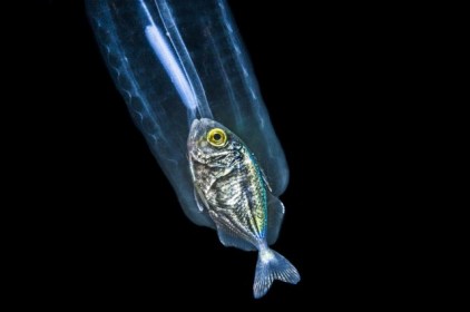 ‘The alien world of the deep sea has some very odd inhabitants.Photographer Wayne MacWilliams dove 150 meters (500 feet) into the waters off the coast of Singer Island in Palm Beach, Florida, to capture a particularly fascinating moment from the deep sea’s black abyss.The images show a translucent sea creature, possibly a species of comb jelly, with a shimmering fish in its belly that it had eaten just moments before….’