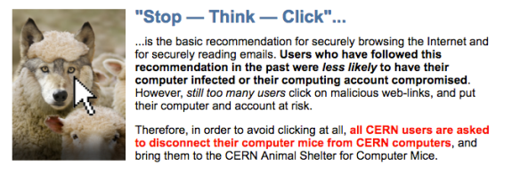 It started out as an April Fool’s joke five years ago with the suggestion that CERN employees retire their mice and use their keyboards only, to prevent clicking on malicious links (like this one, a wolf in sheep’s clothig if I ever saw one):